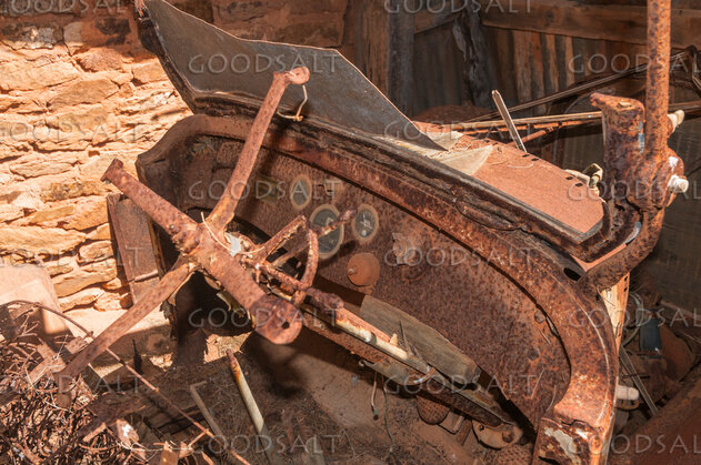 Dash of rusty 1926 Dodge tray truck remains in rear shed of farm house outside old town. by Mal Austin