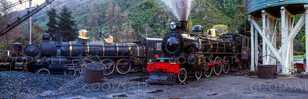 One of two restored vintage "A class" steam engines raising steam near piles of coal. by Mal Austin