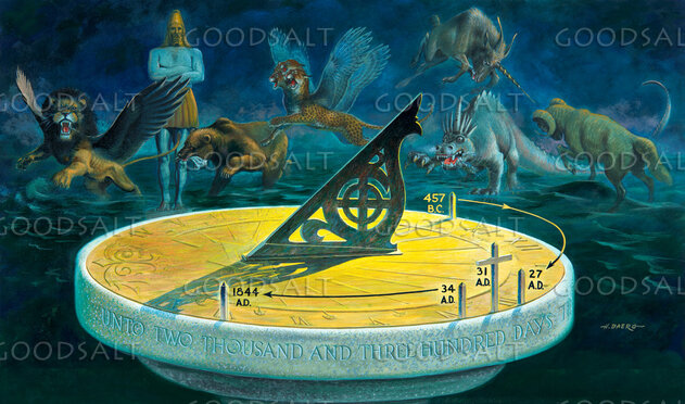 Sundial in foreground of image featuring prophetic beasts and historical dates on the sundial. Unto two thousand three hundred days. by Review & Herald Publishing