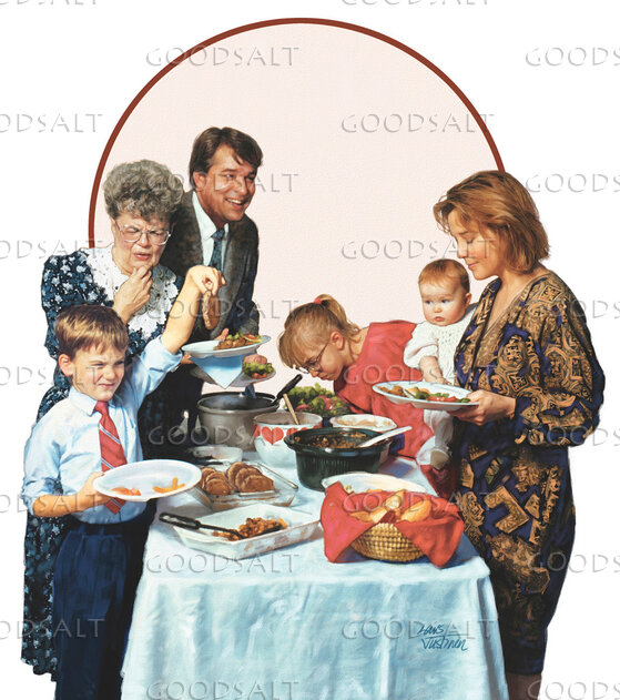 A Church potluck with family gathered around serving table laden with various serving dishes. Little boy makes a face and hold up a patty while older lady looks on disapprovingly. Mom is across the table holding baby and is embarrassed by son's behavior. A girl sniffs something in a bowl. Happy Dad is oblivious to all.