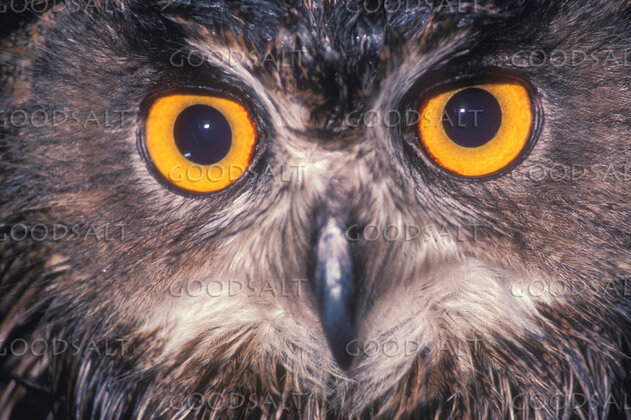 A close-up of an owl's face. by John Baker