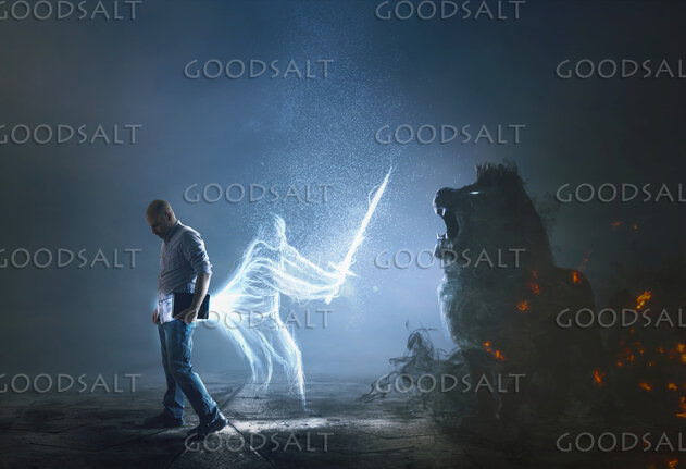 A man with a Bible is attacked by a dark lion by Kevin Carden
