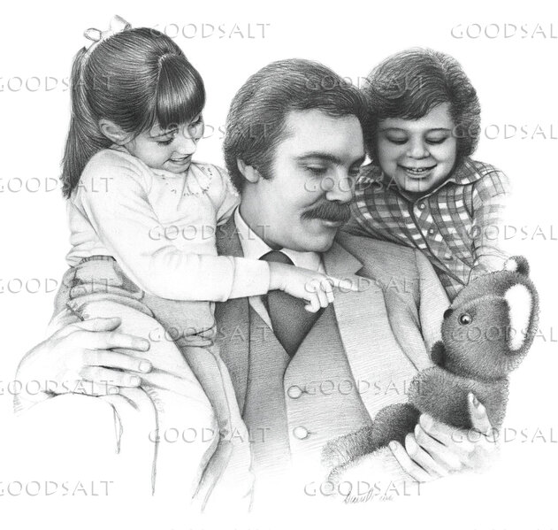 A father holds his daughter and a teddybear as son look on by Darrel Tank