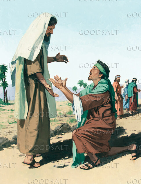 One of the 10 lepers has come back to thank Jesus. He is on his knees in front of Jesus, looking up into Jesus' face. Three of the other men can be seen in the background, walking in the opposite direction. One is looking back to see what is happening.