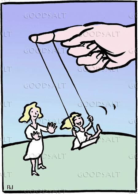 A mother pushing her child on a swing hung on God's finger. by Rolf Jansson