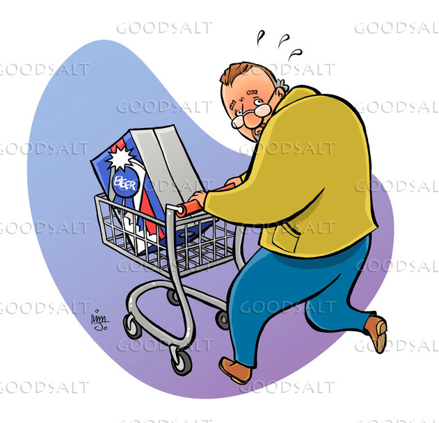 Cartoon of a guilty-looking man shopping for beer to put on his garden. Hoping no one from church or a neighbour sees him with his purchase.He has innocent motives and doesn't want to be a stumbling stone. Editorial style art. Part of a series.