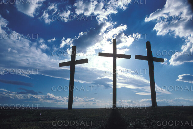 A silhouette of three crosses with fluffy white clouds in the background. by John Baker