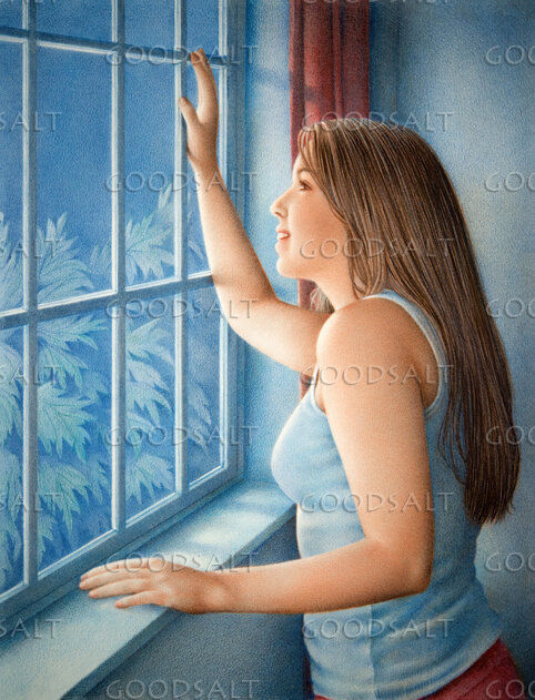 A young woman stands at a window, with an expression of hope. by Darrel Tank