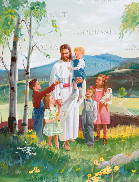 Vintage painting of a group of caucasian children walking through a pastoral setting with Jesus. by Review & Herald Publishing