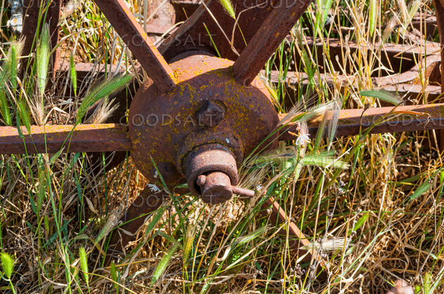 Abandoned rusty farm machinery in the wild flowers and stark environment outside historic old town. by Mal Austin