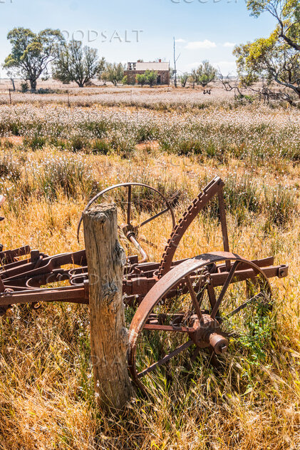 Abandoned rusty farm machinery in the wild flowers and stark environment outside historic old town. by Mal Austin