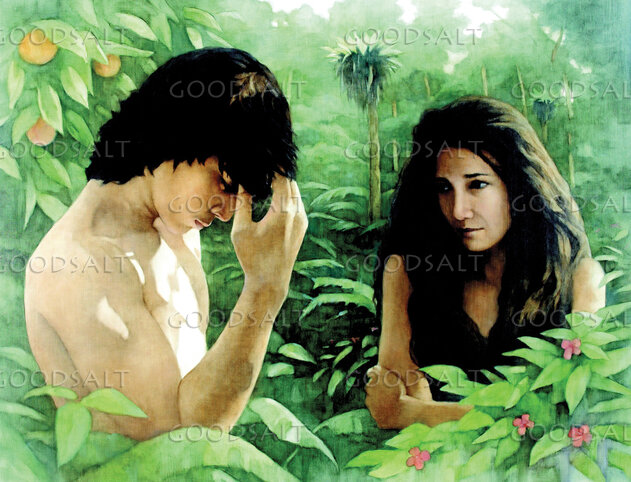 In the Garden of Eden, Adam and Eve are hiding. Their facial expressions show guilt as they look downward. by Lifeway Collection