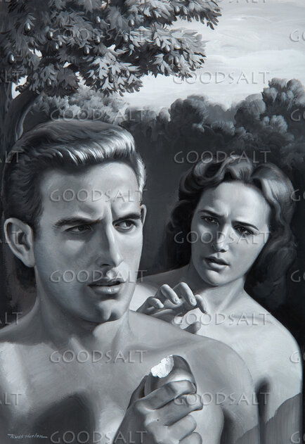 Colorized black and white of Eve tempting Adam. She is standing directly behind him . He looks puzzled but he has taken a bite out of the fruit. She has a "dark" look on her face. Shrubbery around them but no serpent in picture.