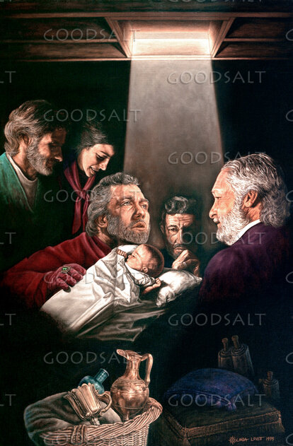 Wise men from the East arrive at the place where the Christ child lay and present their gifts of gold, frankincense and myrrh in basket below. Mary and Joseph watch in approval. Below right are three scrolls of Scripture containing prophecies of the Savior\'s birth.