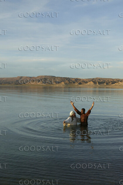 An African man lifts up his hands to the sky after being baptized by Erik Stenbakken