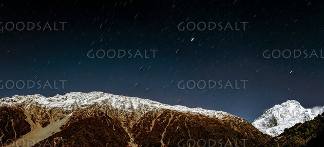 Distant prominent mountain peak, snow-bound hills on clear starry night. by Mal Austin