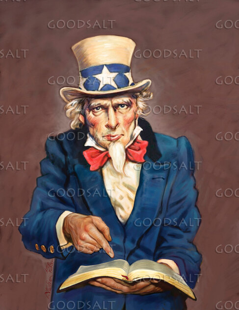 Uncle Sam pointing at an open bible in his hand by Lars Justinen