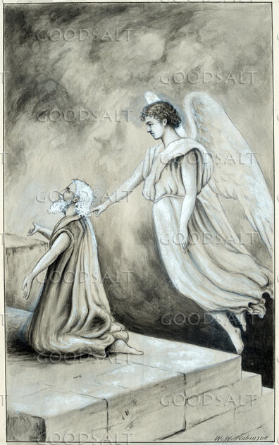An Angel comes to a Prophet who is asking for insight. Grayscale painting. by Review & Herald Publishing
