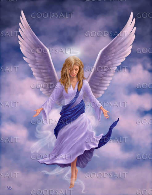 An angel in a blue, purple and mauve cloudy sky looking down upon the earth by Steve Bridger