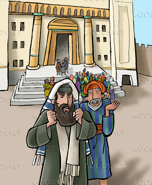Apostle preaches on the temple steps and angers the pharisees and religious leaders. Art style for children\'s division. by Kim Justinen