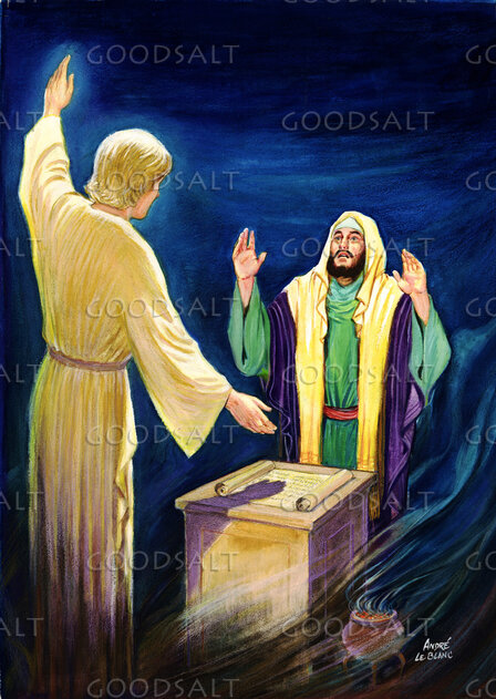 Luke 15 In the days of Herod, king of Judea, there was a priest named Zechariah, of the division of Abijah. And he had a wife from the daughters of Aaron, and her name was Elizabeth.6 And they were both righteous before God, walking blamelessly in all the commandments and statutes of the Lord.7 But they had no child, because Elizabeth was barren, and both were advanced in years.8 Now while he was serving as priest before God when his division was on duty,9 according to the custom of the priesthood, he was chosen by lot to enter the temple of the Lord and burn incense.10 And the whole multitude of the people were praying outside at the hour of incense.11 And there appeared to him an angel of the Lord standing on the right side of the altar of incense.12 And Zechariah was troubled when he saw him, and fear fell upon him.13 But the angel said to him, “Do not be afraid, Zechariah, for your prayer has been heard, and your wife Elizabeth will bear you a son, and you shall call his name John.14 And you will have joy and gladness, and many will rejoice at his birth,15 for he will be great before the Lord. And he must not drink wine or strong drink, and he will be filled with the Holy Spirit, even from his mother's womb.16 And he will turn many of the children of Israel to the Lord their God,17 and he will go before him in the spirit and power of Elijah, to turn the hearts of the fathers to the children, and the disobedient to the wisdom of the just, to make ready for the Lord a people prepared.”18 And Zechariah said to the angel, “How shall I know this? For I am an old man, and my wife is advanced in years.”19 And the angel answered him, “I am Gabriel. I stand in the presence of God, and I was sent to speak to you and to bring you this good news.20 And behold, you will be silent and unable to speak until the day that these things take place, because you did not believe my words, which will be fulfilled in their time.”21 And the people were waiting for Zechariah, and they were wondering at his delay in the temple.22 And when he came out, he was unable to speak to them, and they realized that he had seen a vision in the temple. And he kept making signs to them and remained mute.23 And when his time of service was ended, he went to his home.24 After these days his wife Elizabeth conceived, and for five months she kept herself hidden, saying,25 “Thus the Lord has done for me in the days when he looked on me, to take away my reproach among people.” | |