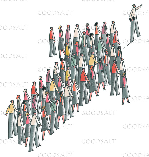 People standing in the formation of an arrow following a leader. by Krieg Barrie