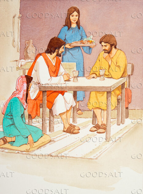 Jesus shares a meal with Lazarus, Martha and Mary. by Lifeway Collection