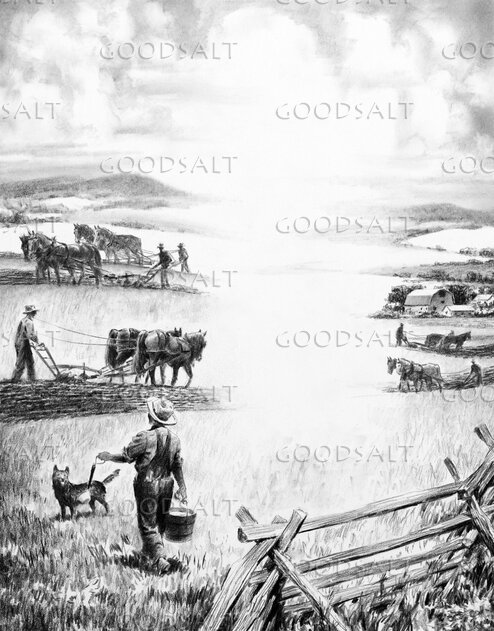 Vintage drawing of farmers plowing up their fields by IDEALS Collections