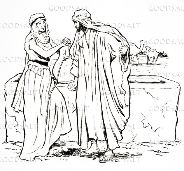 Abram's servant meets Rebekah at the well. by Review & Herald Publishing