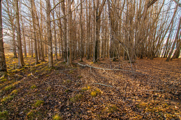 A local thicket of bare trees and autumn leaves heavy underfoot backlit with shadows and highlights. by Mal Austin