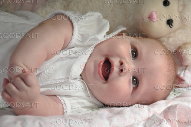 photo of Baby girl laying down with a toy lamb. by Deb Minnard