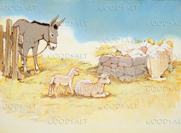 Baby Jesus in manger. Animals around him: donkey, sheep, lamb. Floor is of hay. Manger is homemade with stones and an area left in it for straw and Jesus. Donkey is tied up.