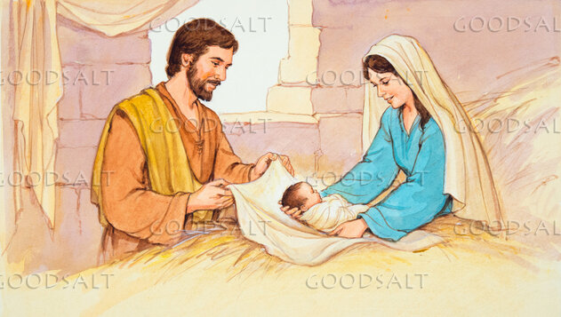The picture shows Mary beside a manger. She appears to be laying Jesus down on the bed of hay. Joseph is to her right, helping her with a blanket. Both are smiling. by Lifeway Collection