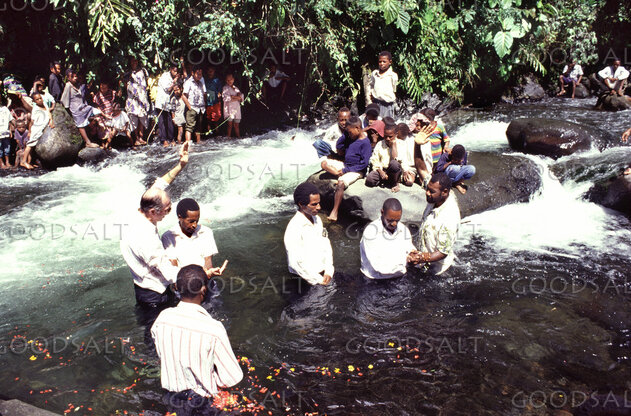 The water was swift and cold as many new believers joined the Maimafu SDA church. It is a custom to throw flower petals and blossoms on the candidates as they come up out of the water. by Mary Lane Anderson