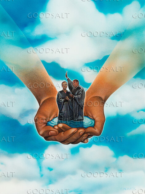 Gods's hands hold the waters of baptism along with a pastor and baptismal candidate. They is an ethnic image, with all figures including God represented as black.