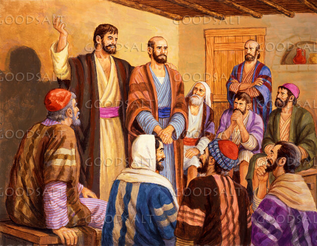 Barnabas stands, defending Paul. by Lifeway Collection