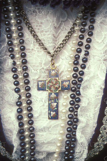 Beads of pearls and a cross necklace on lace. by John Baker