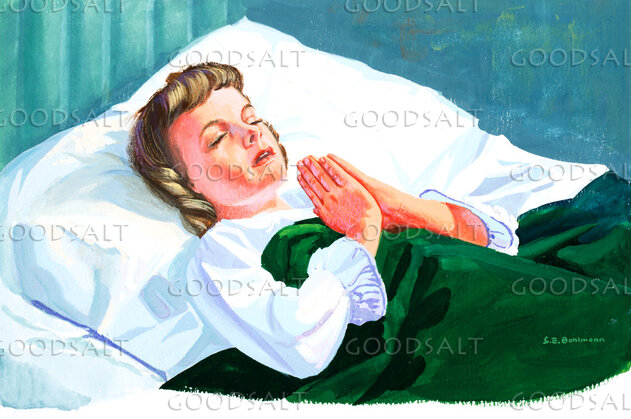 Vintage painting of a caucasian girl praying in her bed. by Review & Herald Publishing