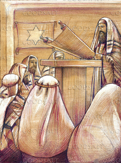 A group of biblical men listen as the word is read by their rabbi by Darrel Tank