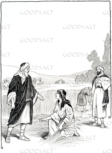 Boaz meets Rachel as she gleans in the field. Black and white ink style illustration. by Review & Herald Publishing