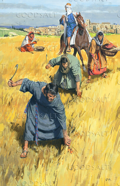 Boaz is in the field on horseback. Other men are also seen in the field. Ruth is seen kneeling to glean from the field. by Lifeway Collection