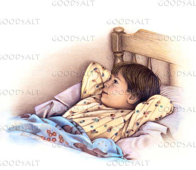 A little boy lays in bed awake with smile on face by Darrel Tank