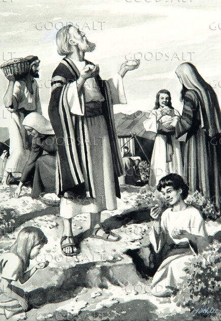 Moses and the children of Israel gather manna sent from God. The morning dew covered the ground and after the dew disappeared the ground was covered with thin flakes that looked like frost. Moses said that this is the bread that the Lord has given you to eat. Moses is standing with his arms outstretched and manna in each hand. Th people are standing or kneeling and picking up the manna and putting it in baskets. This is a black and white picture. Tents in background, children eating in the foreground.