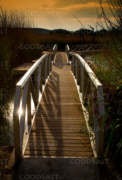 Boardwalk and bridge over a stream of water with orange sky in background by Jim Work