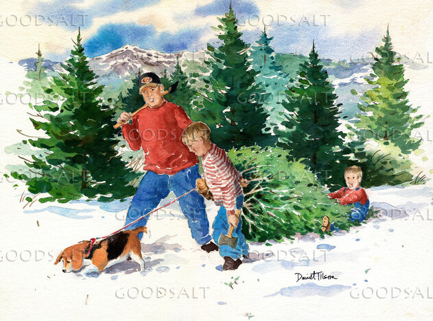Man,two boys and a dog taking home a Christmas tree by Daniel Tilstra