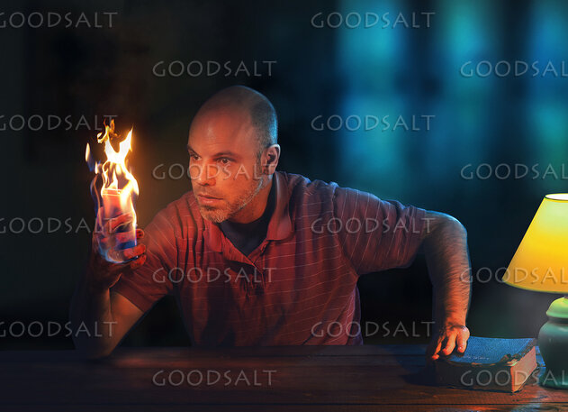 A man holds on to a burning cell phone at night. by Kevin Carden