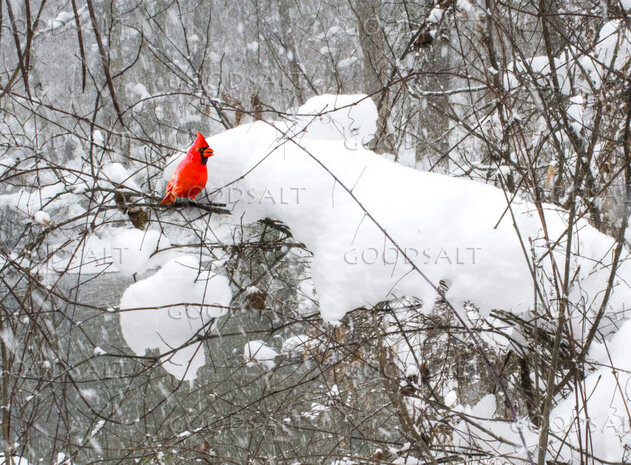 A photo of a bright red cardinal sharing a branch with a lot of snow. Winter scene by Deb Minnard