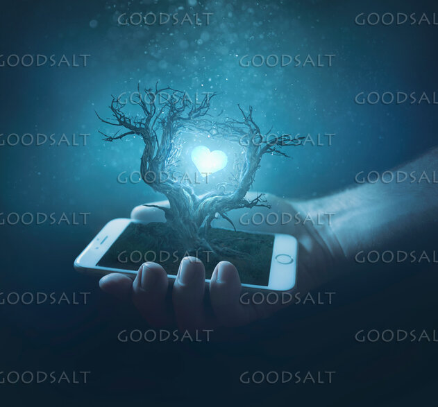 Holding a cell phone with a tree rising from the screen and glowing heart