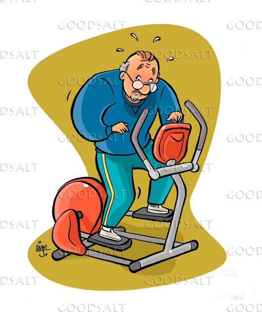 older man on elliptical trainer at the gym, pushing buttons on the programmable machine. whimsical editorial style art. Part of a series. by Kim Justinen