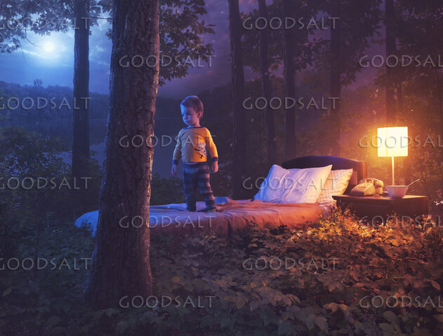 Surreal image of a young boy on his bed in the middle of the night forest. by Kevin Carden